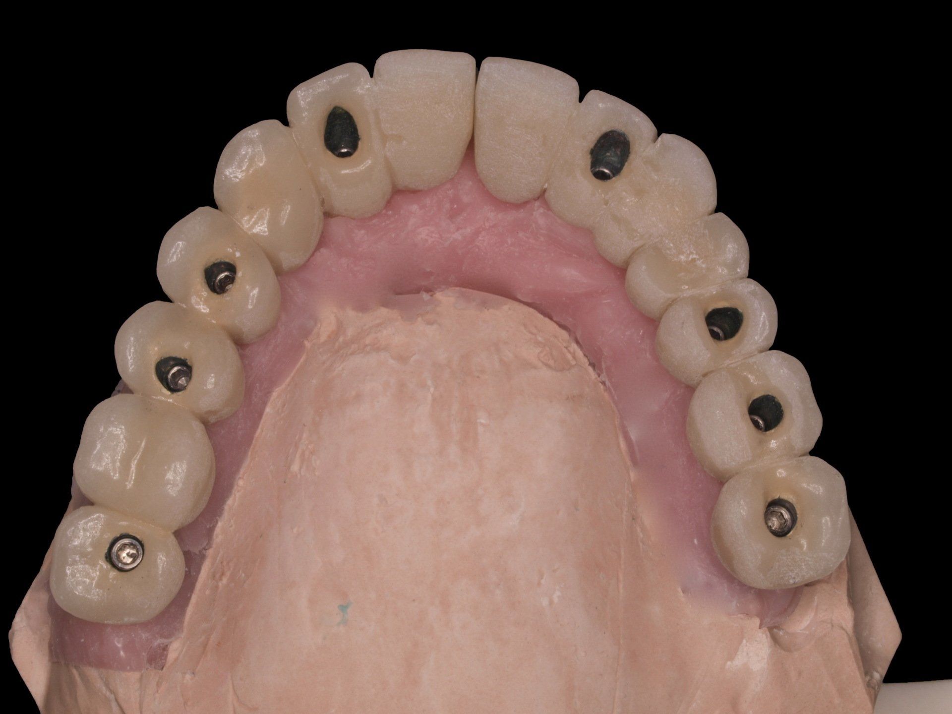 Las prótesis fija son estructuras cerámicas con núcleos internos de distintos materiales (metal, zirconio, peek) que van sobre 6 u 8 implantes. Estas estructuras pueden ir atornilladas o cementadas sobre pilares protéticos o directamente atornilladas al implante.